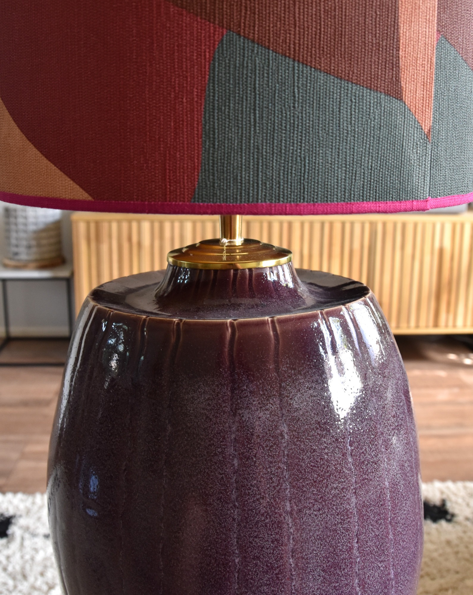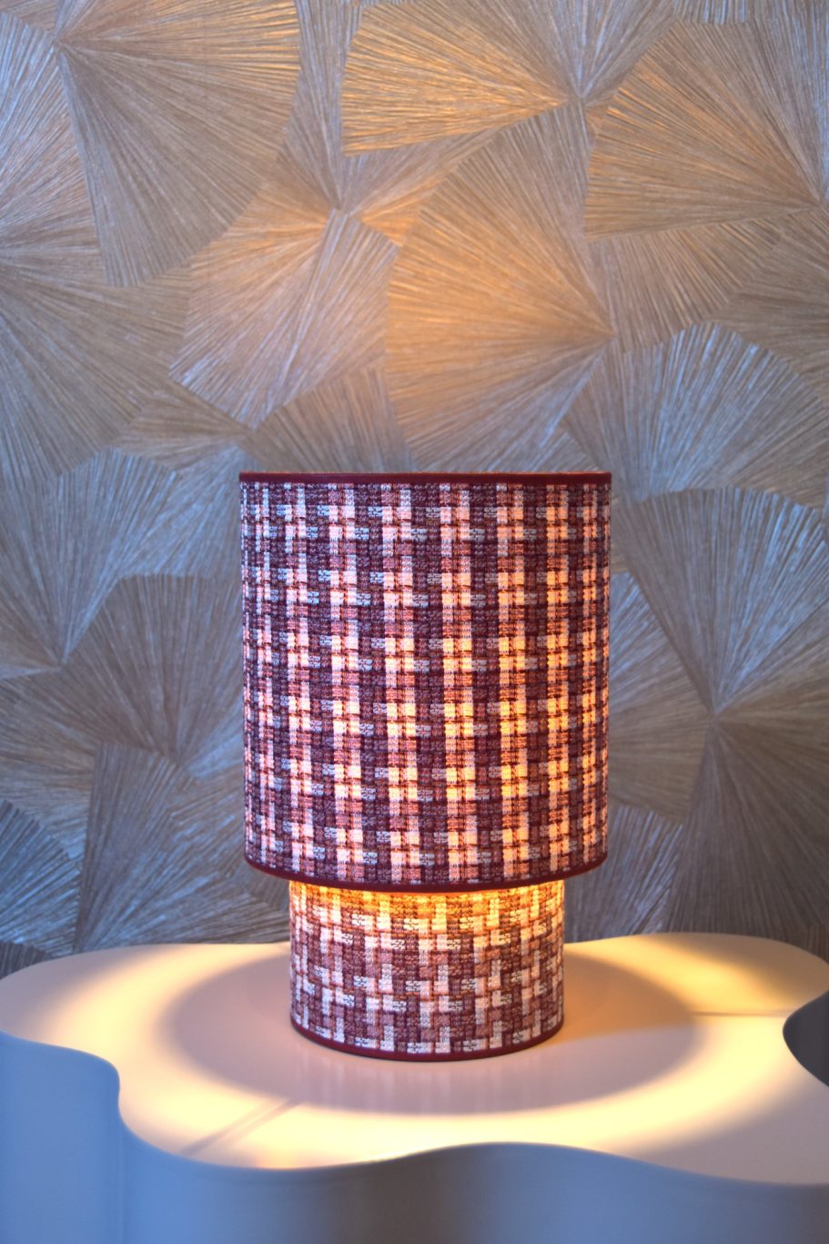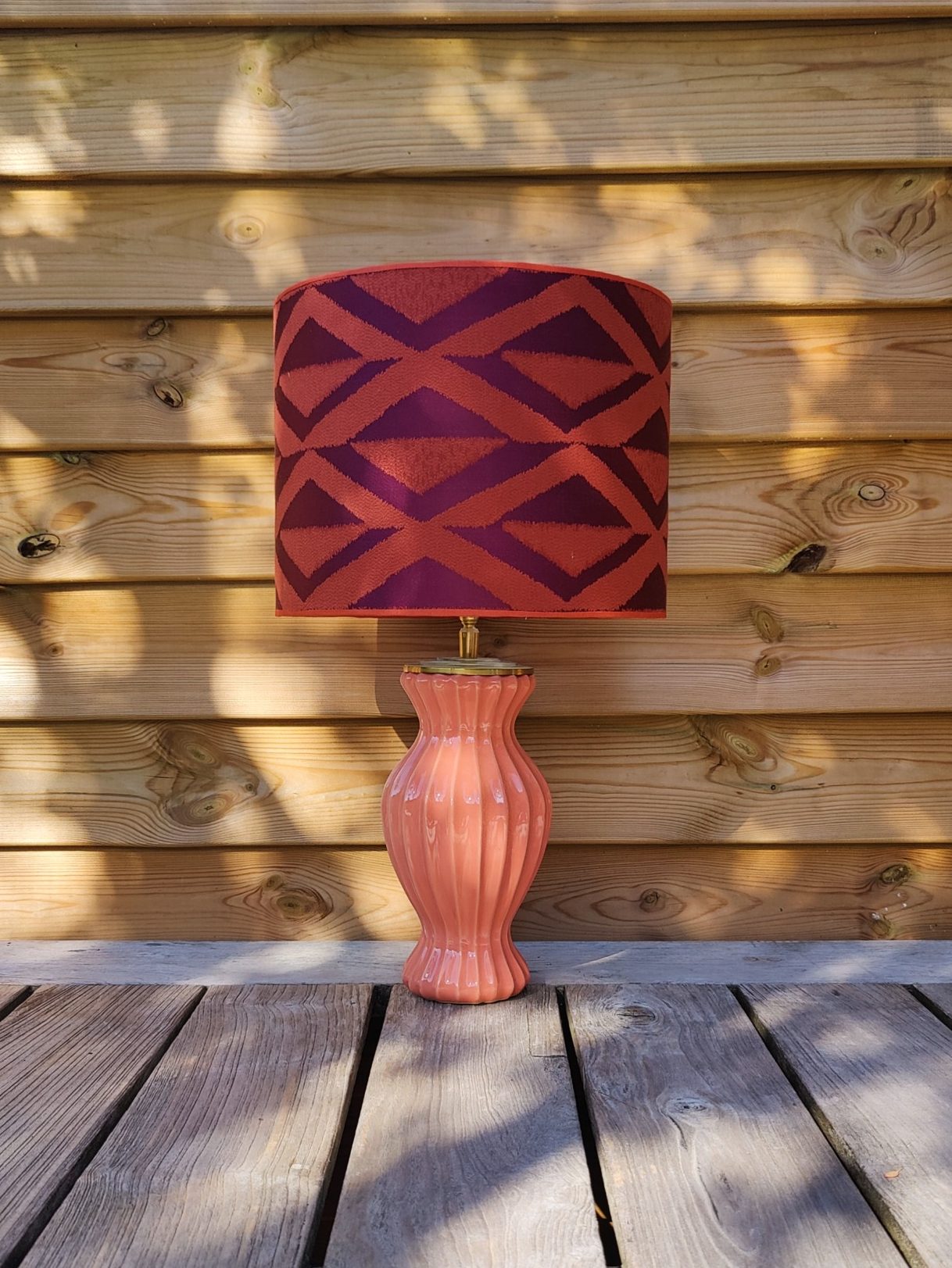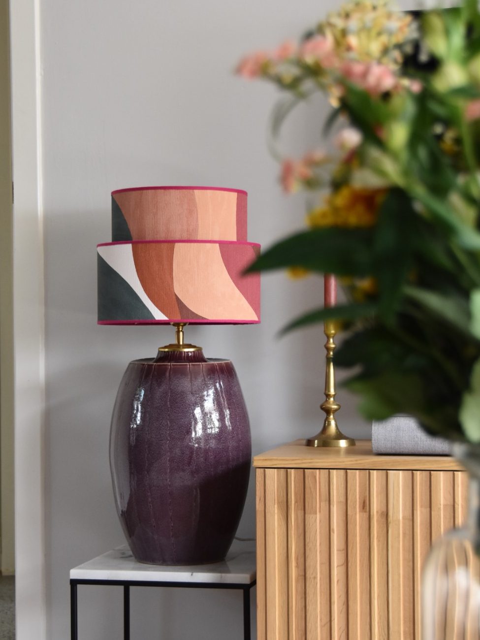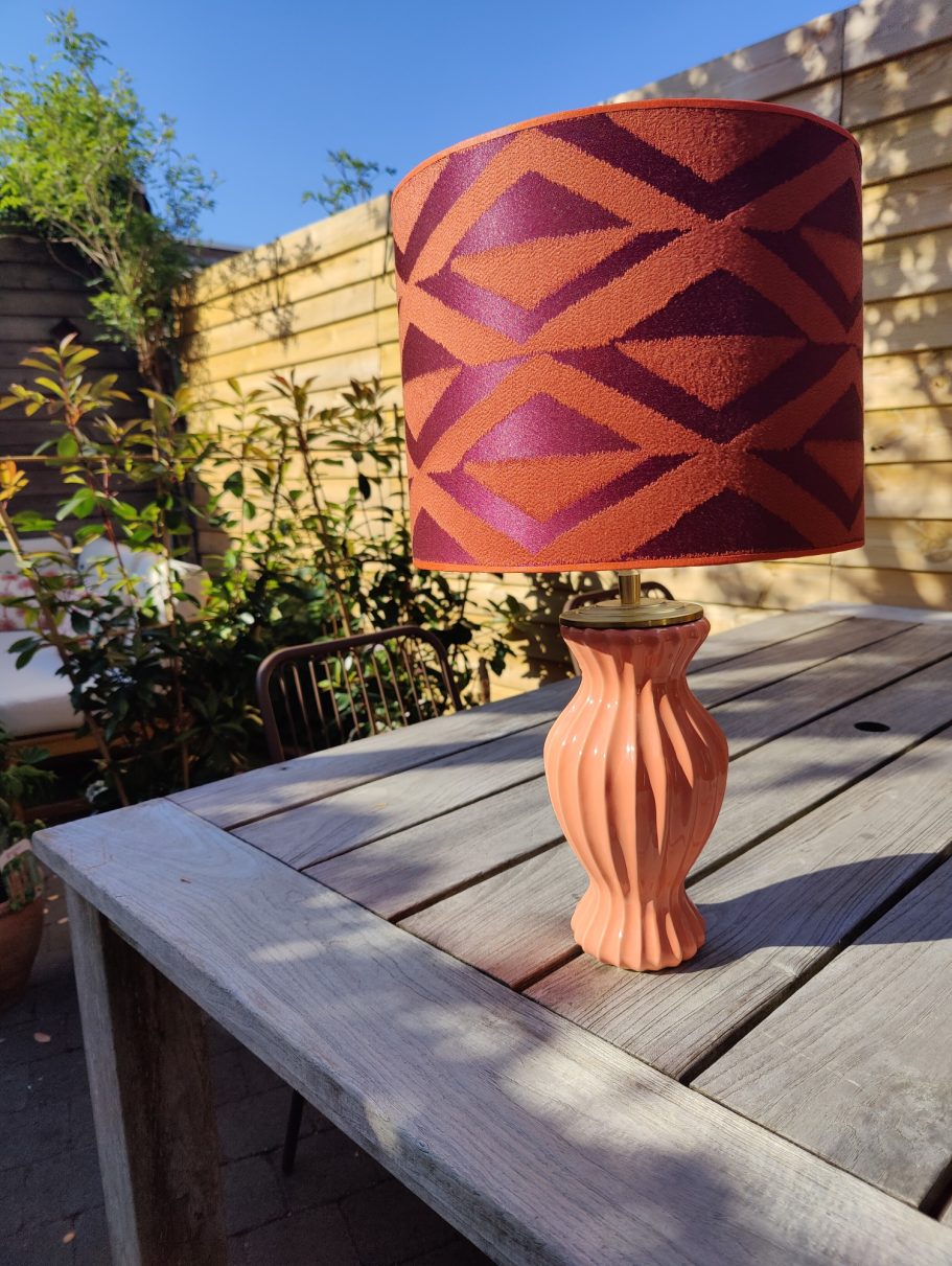 Deze lamp is een speelse mix van elegantie en lef. De zalmroze voet brengt zachtheid en warmte, terwijl de geruite kap in bordeauxrood en paars zorgt voor een krachtig kleuraccent.