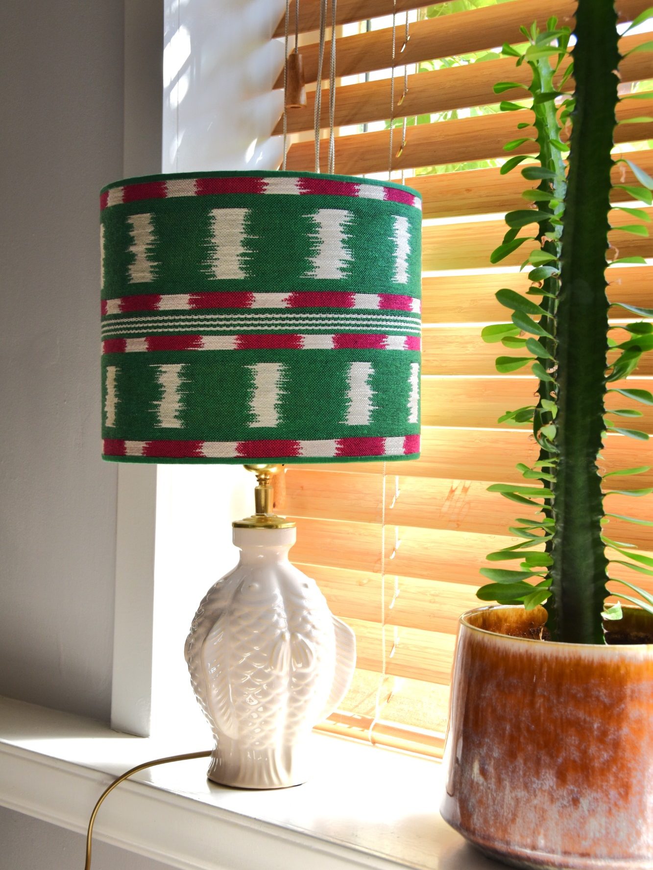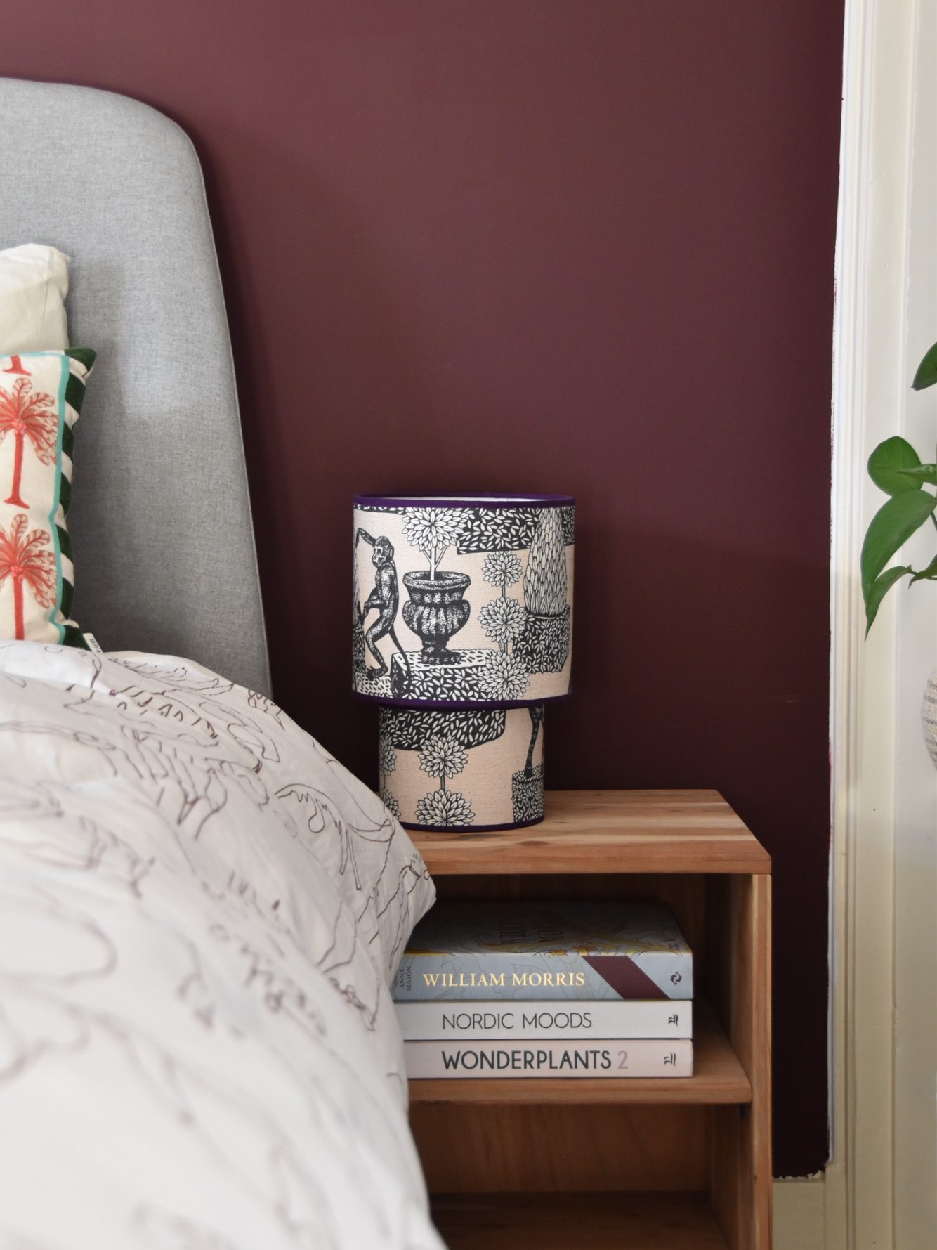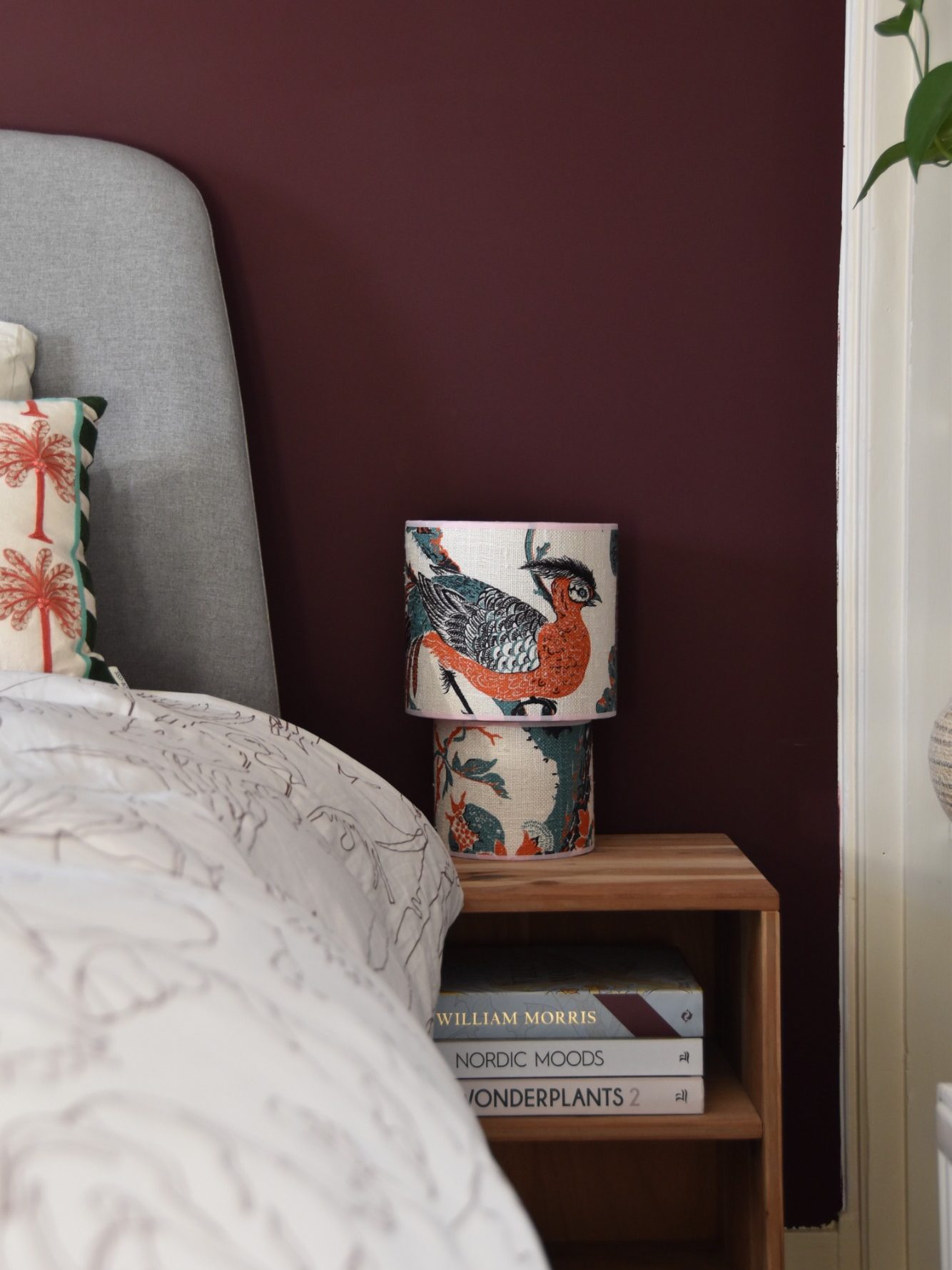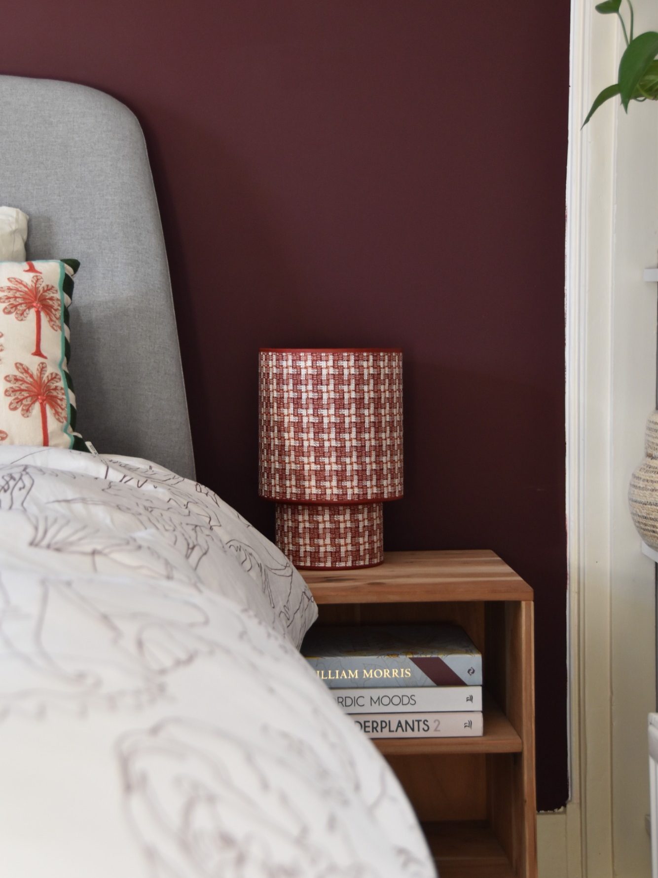 Deze lamp is een speelse mix van elegantie en lef. De zalmroze voet brengt zachtheid en warmte, terwijl de geruite kap in bordeauxrood en paars zorgt voor een krachtig kleuraccent.