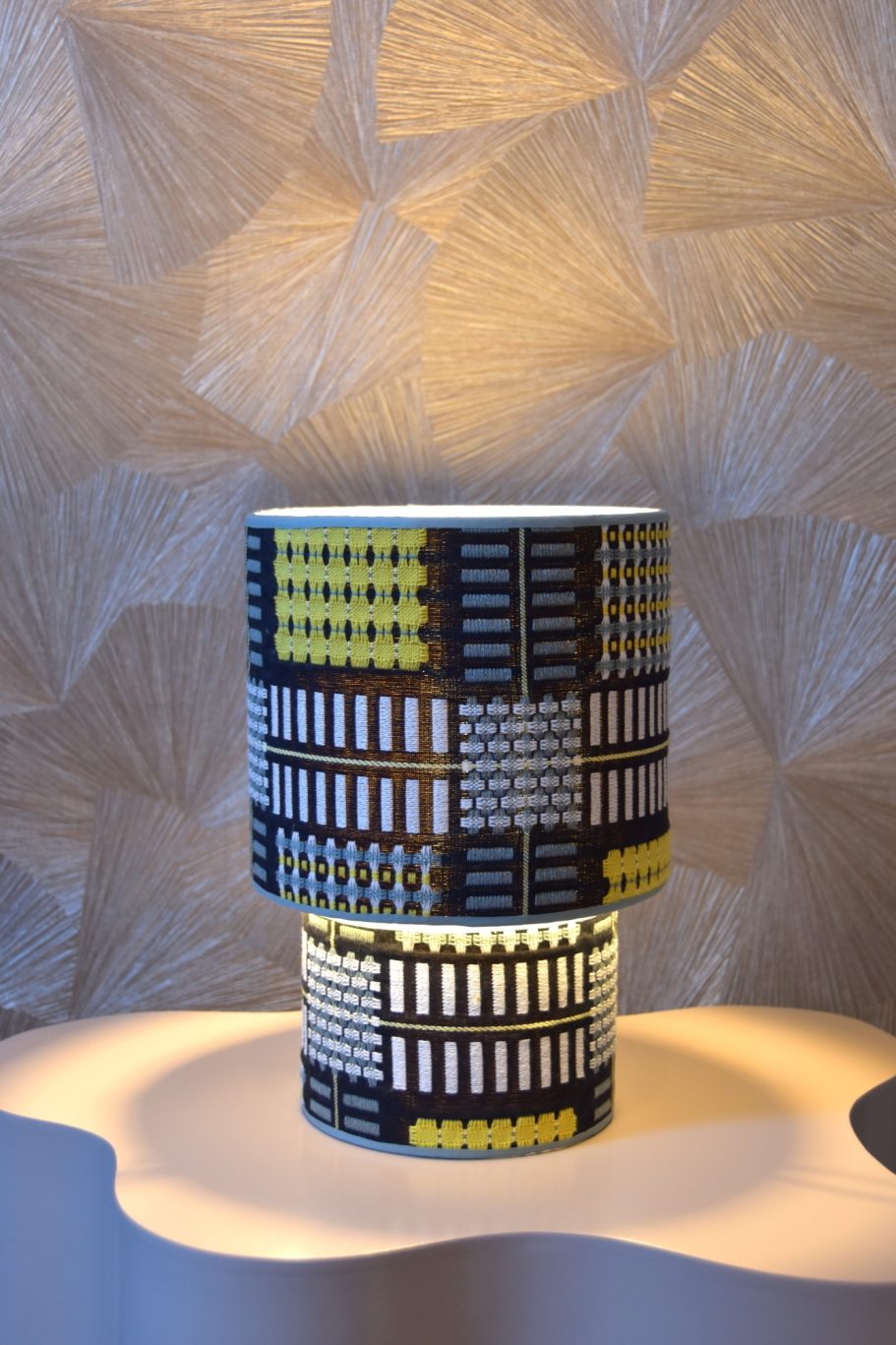 Stel je een lamp voor die niet zomaar licht geeft, maar een glimlach tovert op je gezicht. De kap is bekleed met een speelse mix van kleurrijke cirkels, sprankelende vlakke en vrolijke texturen.