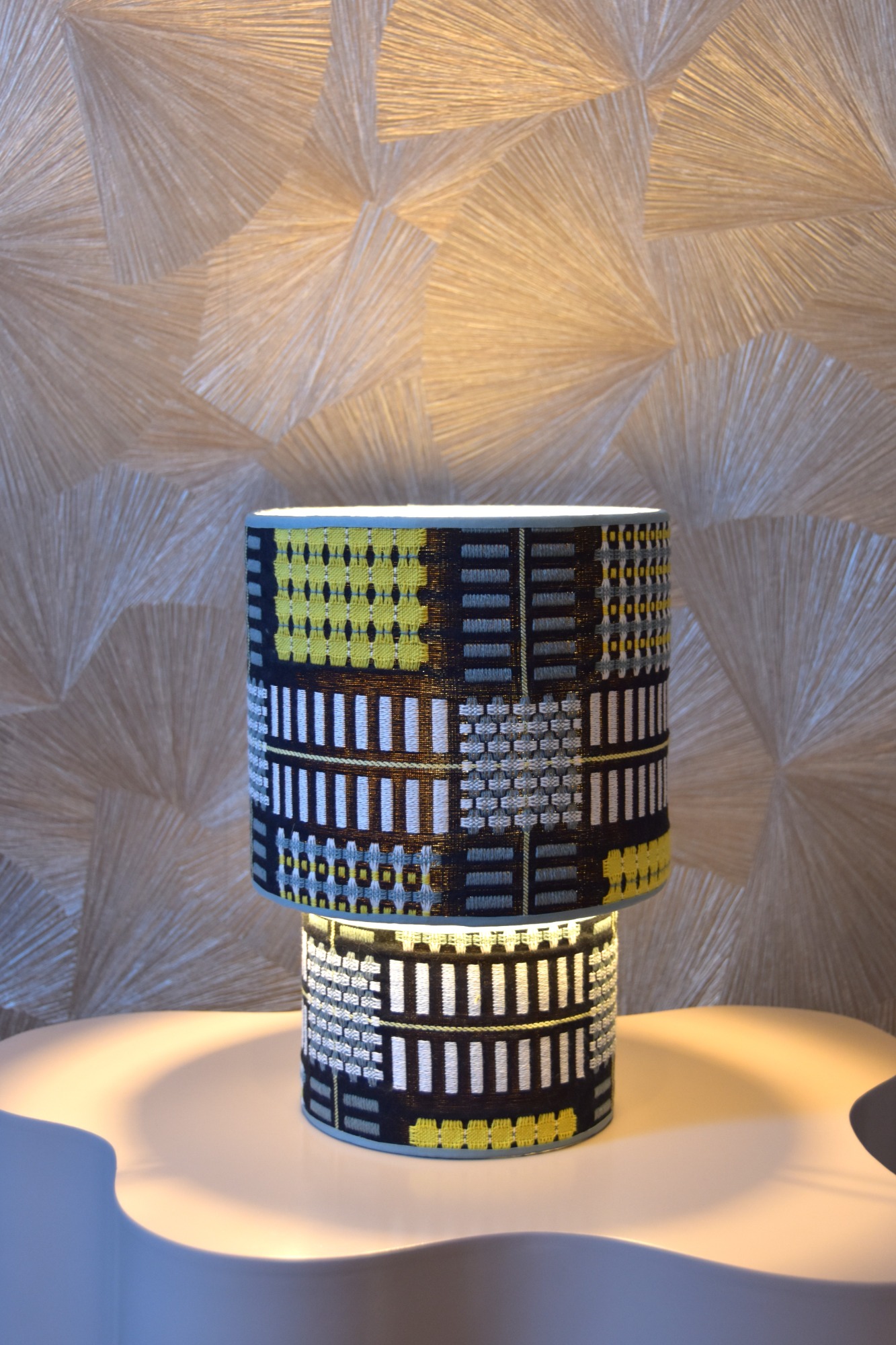 De stof heeft veel weg van pied-de-poule, een hanenpoot patroon. Geef hem een peertje en hij geeft lumière!